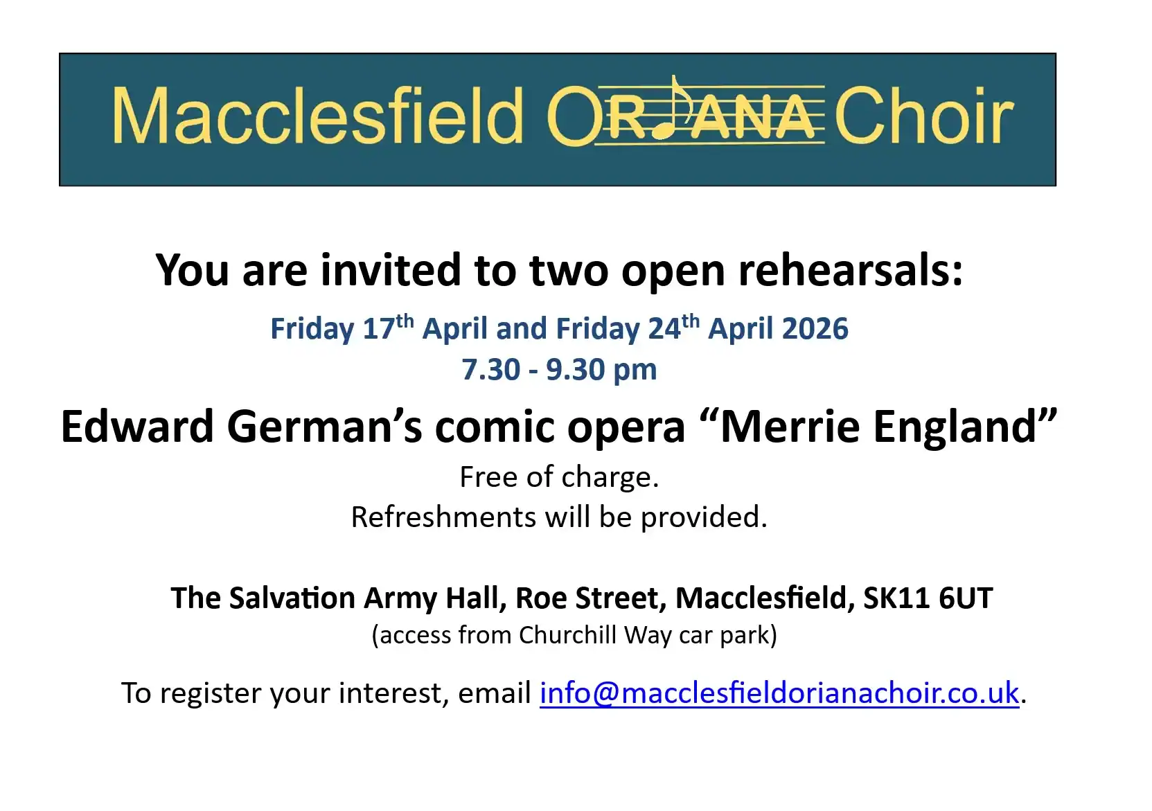 Macclesfield Oriana Choir is a mixed voice choir and performs a wide variety of choral music with three concerts a year and a singing day. Rehearsals take place every Friday from 7.30 to 9.30 pm at The Salvation Army, Roe Street, Macclesfield.